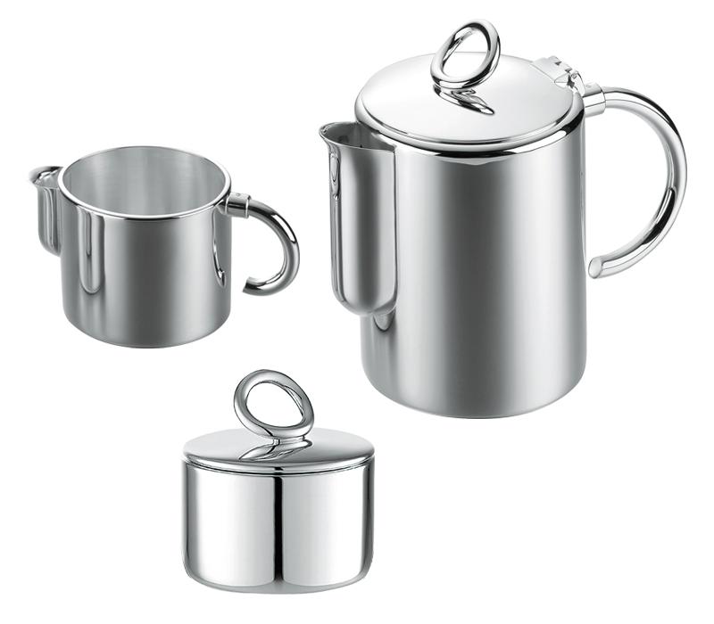 Childhood memories of her own round-handled beaker were what inspired André Putman to create for Christofle this beautiful silverplated coffee and tea service. The French designer decorated each lid with an elegantly looped ring, a hallmark feature of all her designs. You can find further tableware from the "Vertigo" collection below.