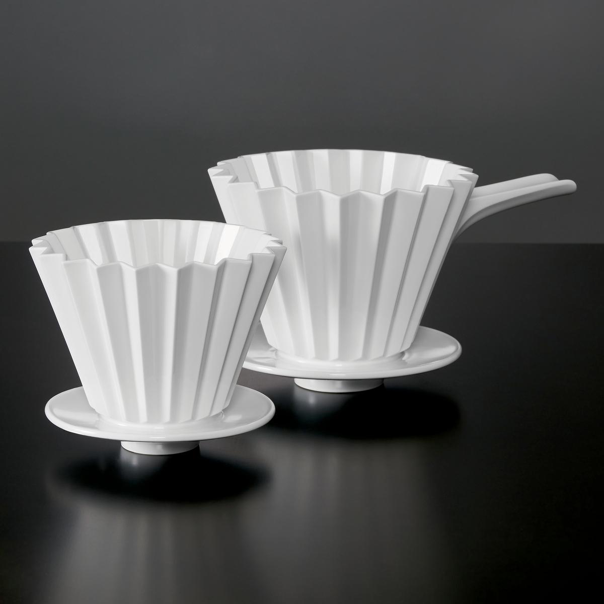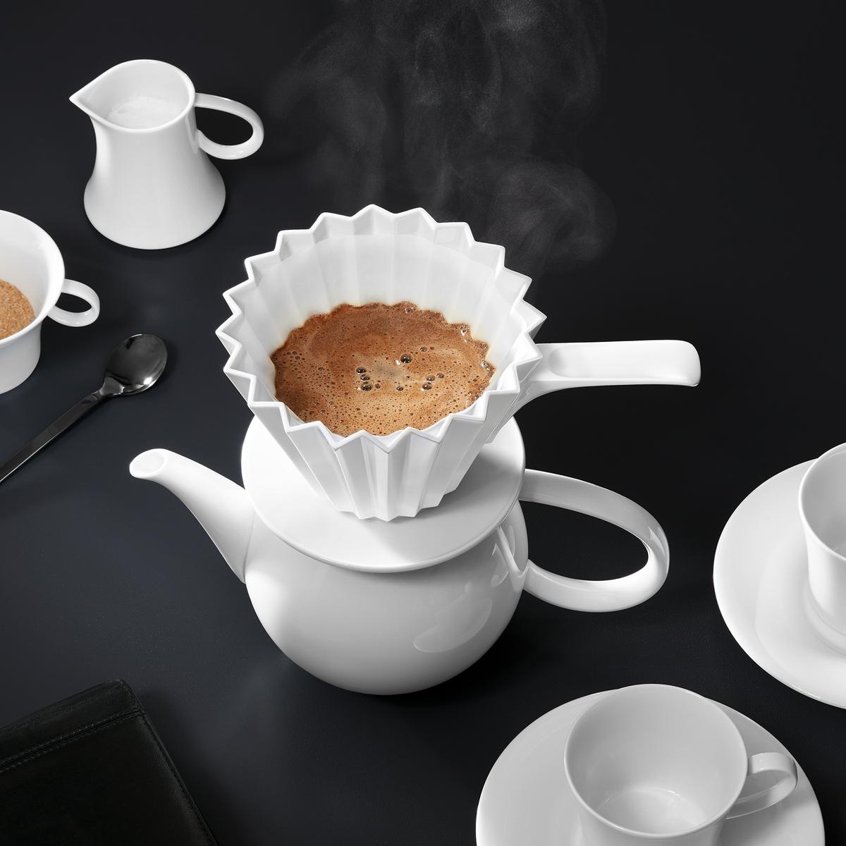 The thermo filter is available in two different sizes. Size 2 is recommended for preparing one to two cups of coffee. Size 4, fitted with an ergonomically shaped handle, is conceived for up to four cups. You can combine the KPM porcelain coffee filter with all the classical and modern coffee services produced by KPM.