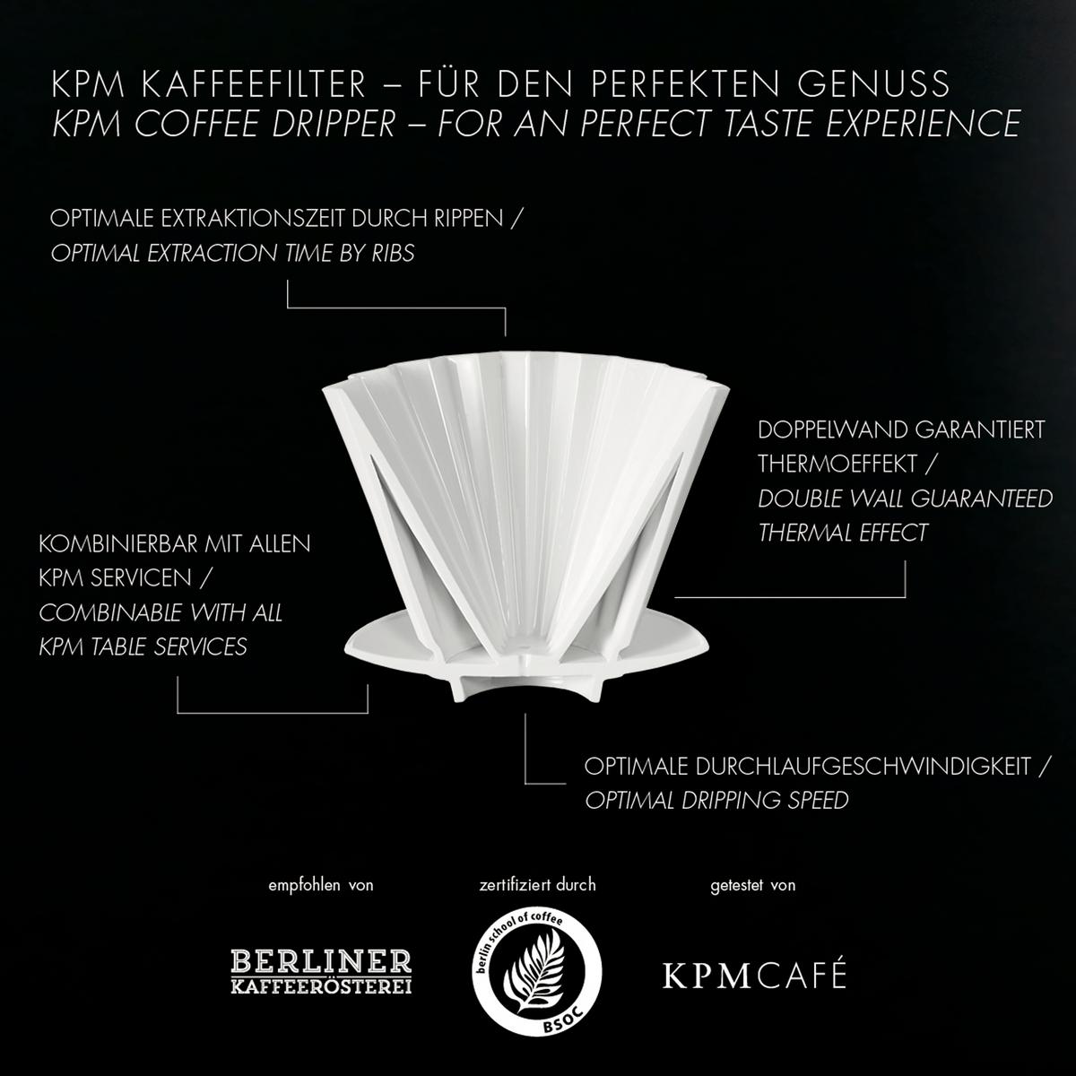 KPM has managed to develop a coffee filter that helps the delicate aroma of the coffee to reach its full potential. Thanks to the double-walled design a cavity is created in which the air can circulate. This thermo effect holds the water at the ideal temperature during the filter procedure – reducing the loss of temperature. The outside surface does not become hot, so that it is no problem to pick up the coffee filter with your bare hands.