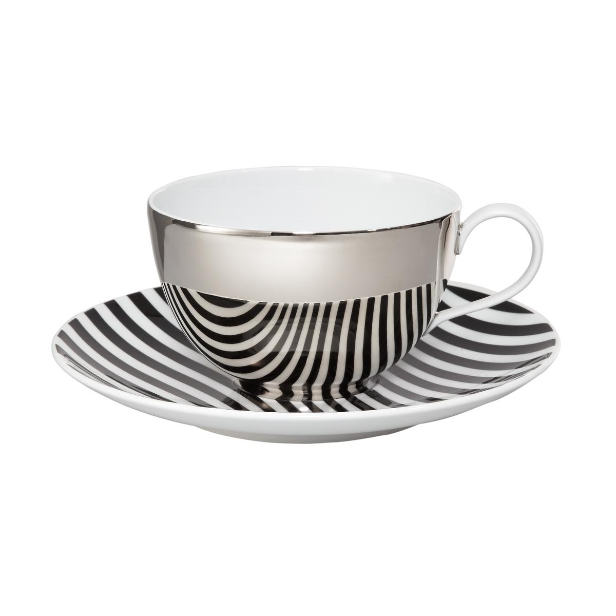 The cups of the "Urbino Platinum Edition" by KPM’s head designer Thomas Wenzel present an impressive interplay of mirror images and perspectives. A modern black and white design adorns the saucers. The cup is coated with gleaming platinum and reflects the design of the saucer in diverse ways, depending on the angle from which you look at it.