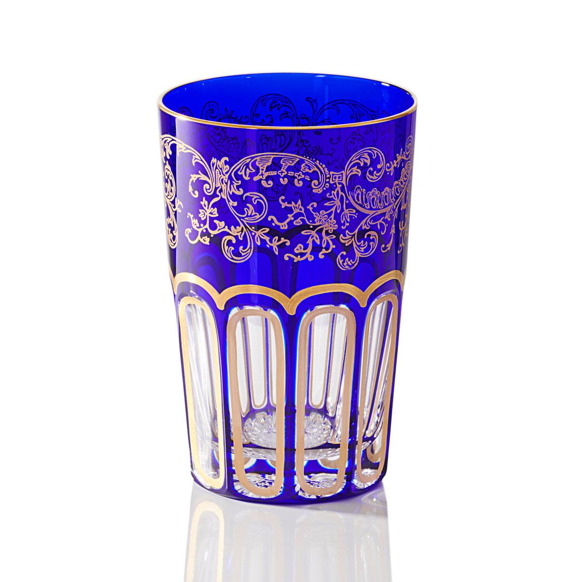The "Rabat" tea glasses from Saint-Louis seem to have been taken straight out of "One Thousand and One Nights". Their gemstone-coloured, crystal-glass bodies shine brightly in ruby red, emerald green or sapphire blue and are adorned with 24-carat gold patterns and a magnificent cut.