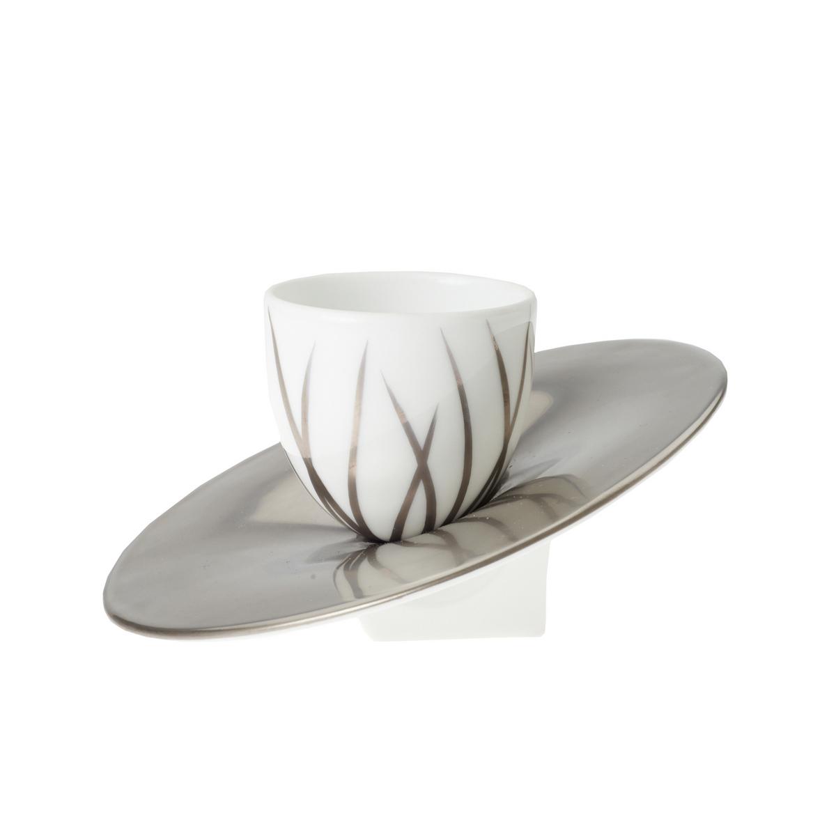 Uncompromising luxury: the "Toundra" service is another minor work of art made of delicate Limoges porcelain, and produced entirely by hand by J.L Coquet. The plates, based on the "Hémisphère" shape, have a delicately structured and especially broad rim. Parts of the "Toundra" decoration, which reminds one of soft grasses, can be combined perfectly with the platinum-coloured plates from the "Hémisphère" service. The cups offer two possible combinations as well: either the cups and saucers both of "Toundra" design or a "Toundra" cup on a "Hémisphère" platinum-edged saucer. Each item of the handmade service is unique.