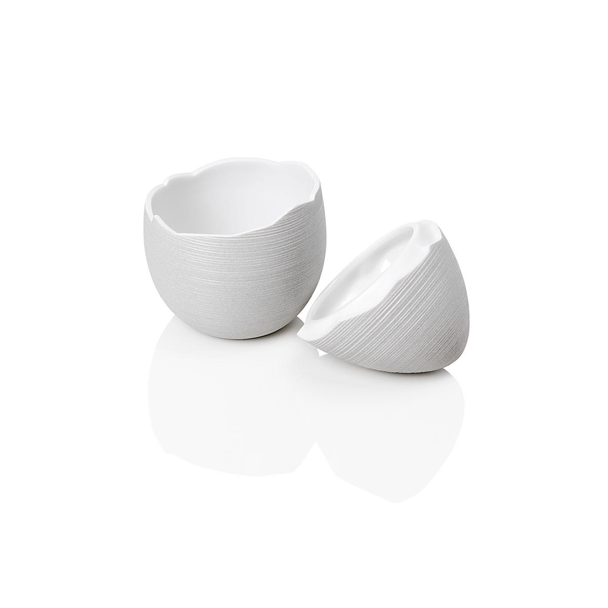 The "Hémisphère" matching tray in plain white provides the broken egg the perfect stage for its appearance. The broken egg has the velvety textured surface characteristic of the "Hémisphère" line. The tray, on the other hand, is made of shiny glazed Limoges porcelain.