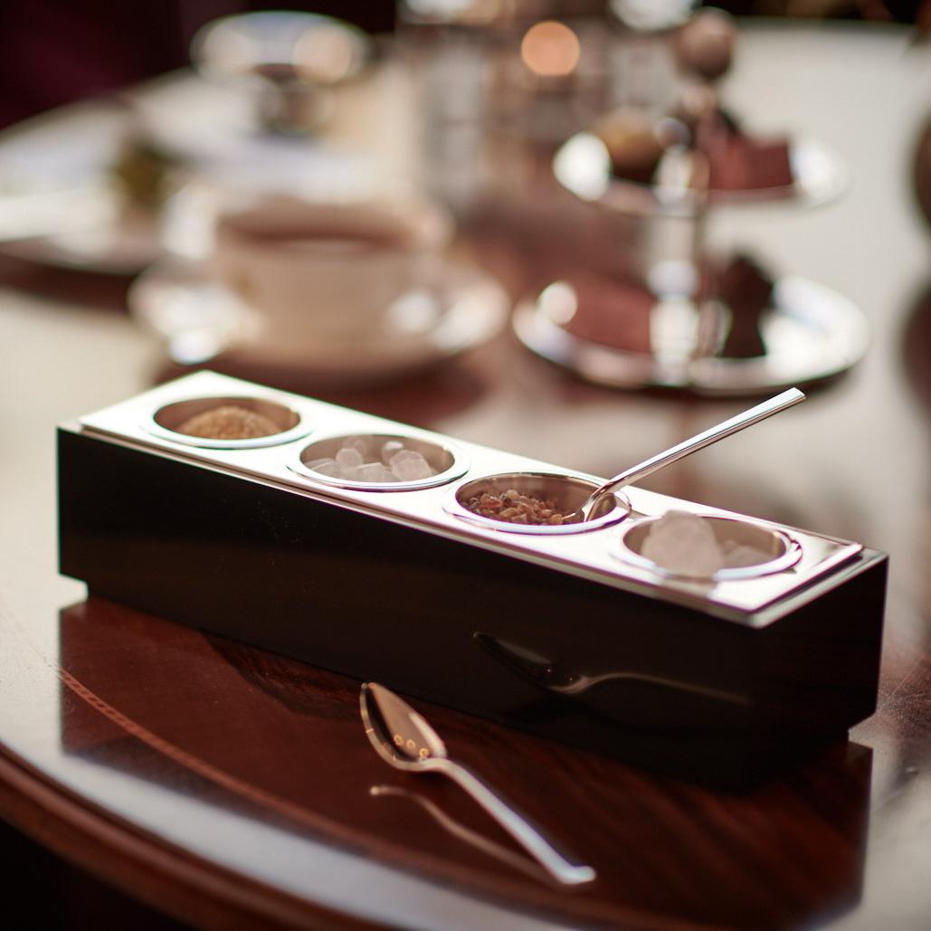Luxury breakfast: In these removable dishes from Robbe & Berking different sorts of jam and sugar can be stylishly served. The frame for the elegant quartet is out of black Corian and silver. The silverplated ensemble is available in two sizes. The slightly bigger version is intended for sugar and jam (here pictured) whilst the smaller one is for salt. Also available in (925) sterling silver.