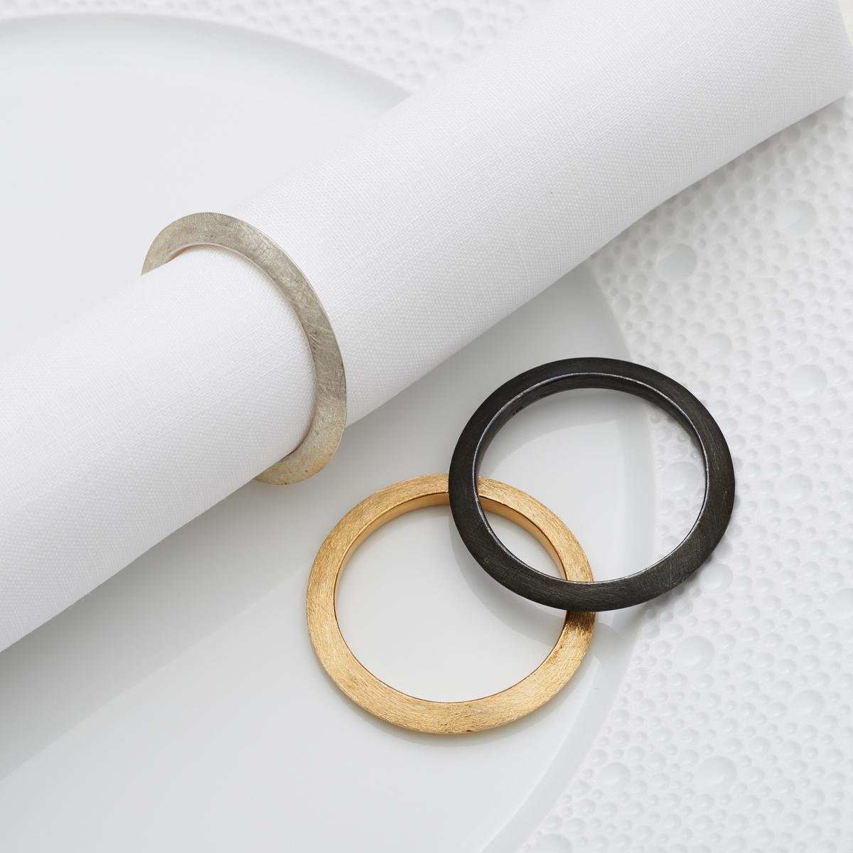Combining modern with traditional design, these "Pure" napkin rings are by Berlin designer Horst Max Lebert whose works can also be seen at the New York Museum of Modern Art. These exquisite rings are available in three different finishes: oxidised sterling silver, sterling silver and silver with fine gold plate.