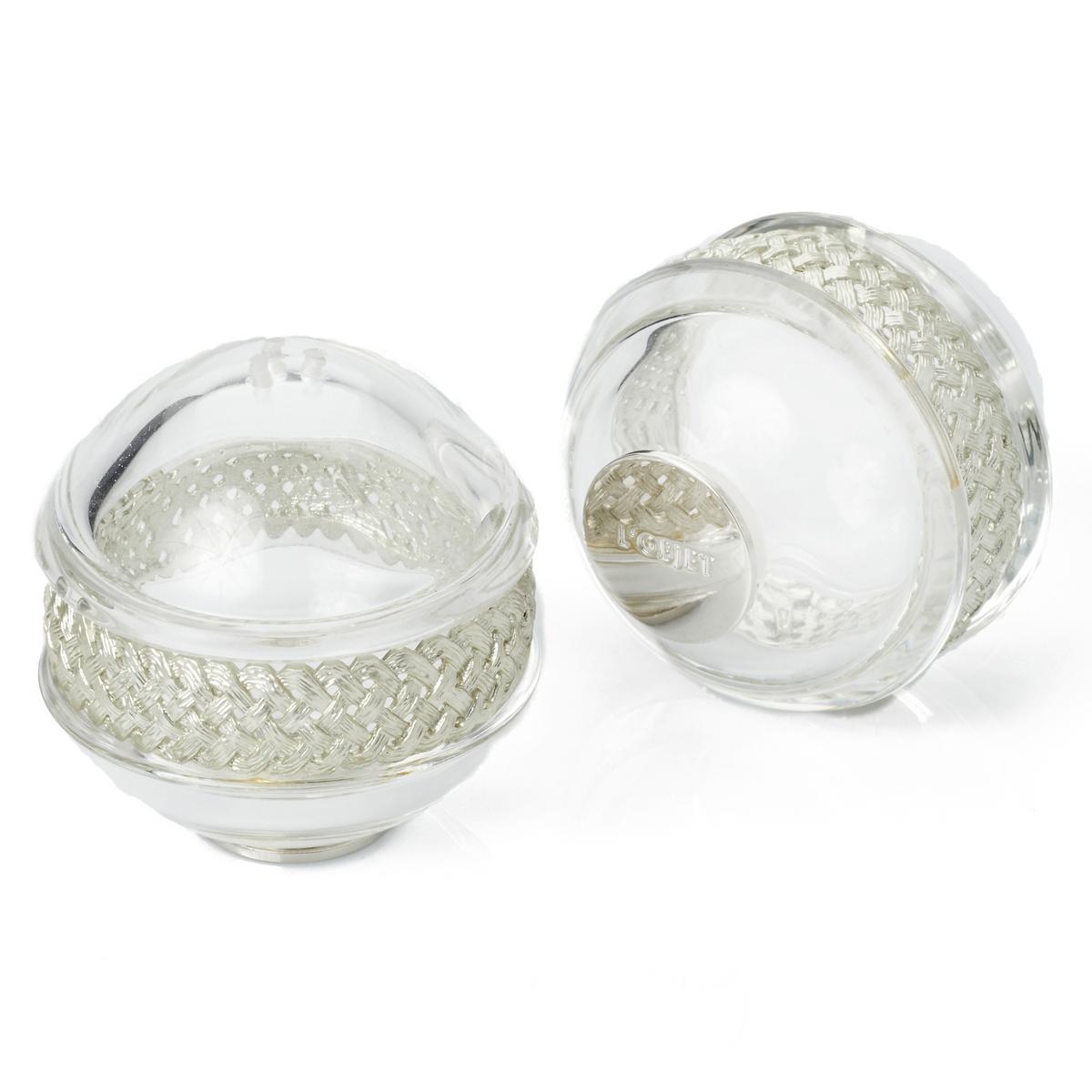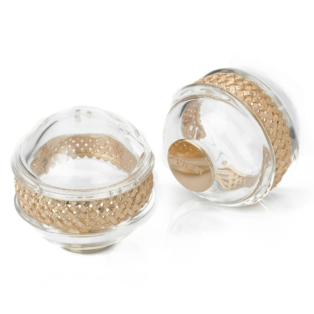 The spices are packed away inside the "Braid" salt and pepper shakers from L’Objet as if they were in an elegant showcase: safely stored behind crystal glass. Around their middles, there is a decorative ribbon made of woven 24-carat gold-plated or platinum-plated brass which is so artistically made that it looks like a luxury bangle.