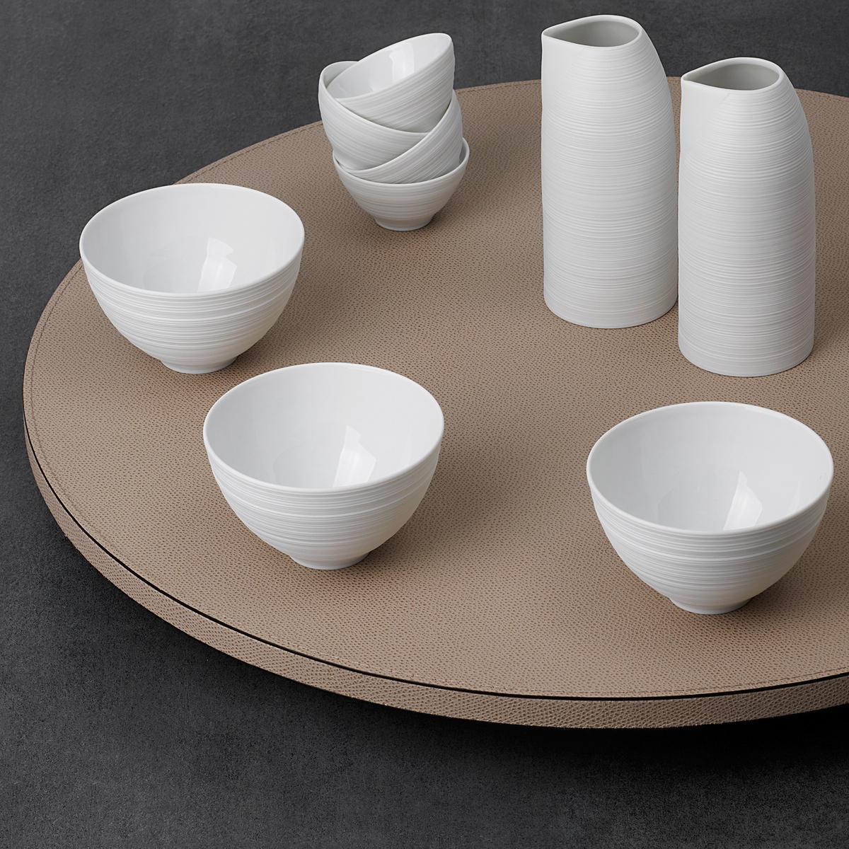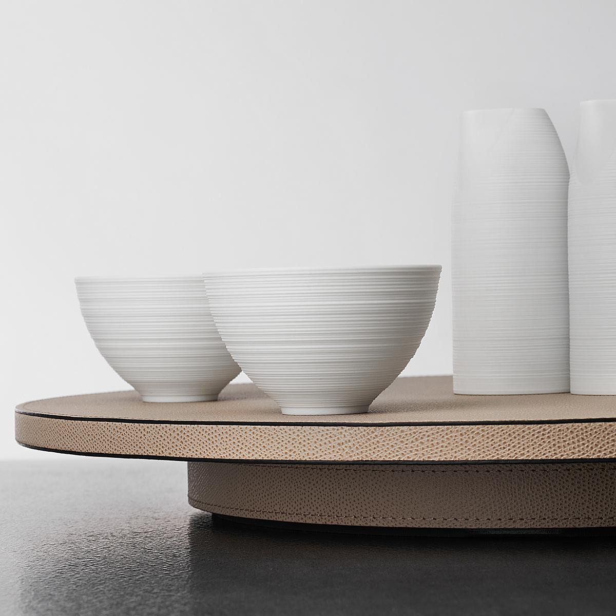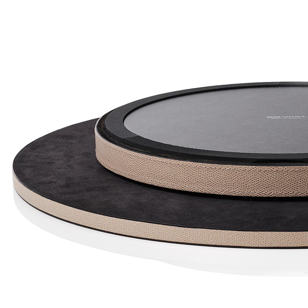 With a diameter of approximately 50 cm, the "Lazy Susan" rotating trays by GioBagnara offer enough space to position enough items on it. The rotating tray can be used, for example, for oils, spices or the like, if everyone at the table should have access to it. At the same time, the rotating tray is a decorative centerpiece on which vases or other accessories can be decorated. The calf leather has a scratch and water resistant surface and the base is made of non-slip suede.