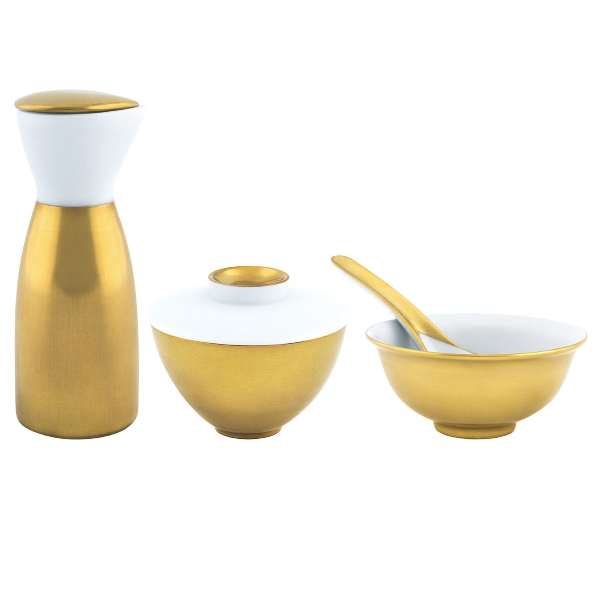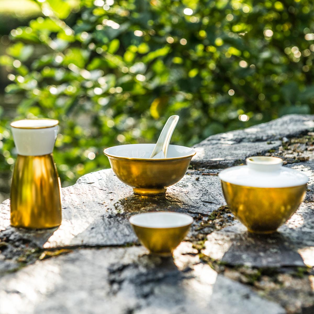 Finest French porcelain with Asian flair from the famous porcelain centre of Limoges. With the "Asia Gold" line, J.L Coquet has created an extremely exclusive-looking service specially for serving Far-Eastern culinary delicacies: from the golden rice bowl to the slim little bottle of Sake, from the delicate spoons to the white cloche, and from the Sake cup to the Sushi platter.