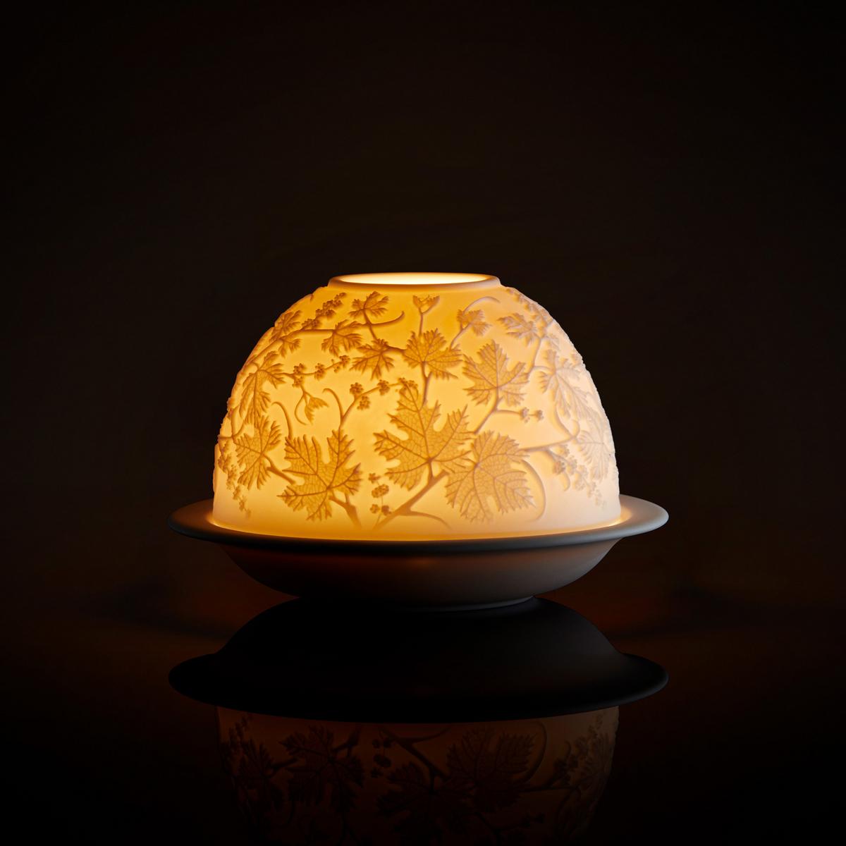 "Lichtspiel: Zündet man ein Teelicht in der Votivlampe "Grüne Weintrauben" an, bringt der Kerzenschein das zarte Weinblätterrelief im Porzellan zum Vorschein."