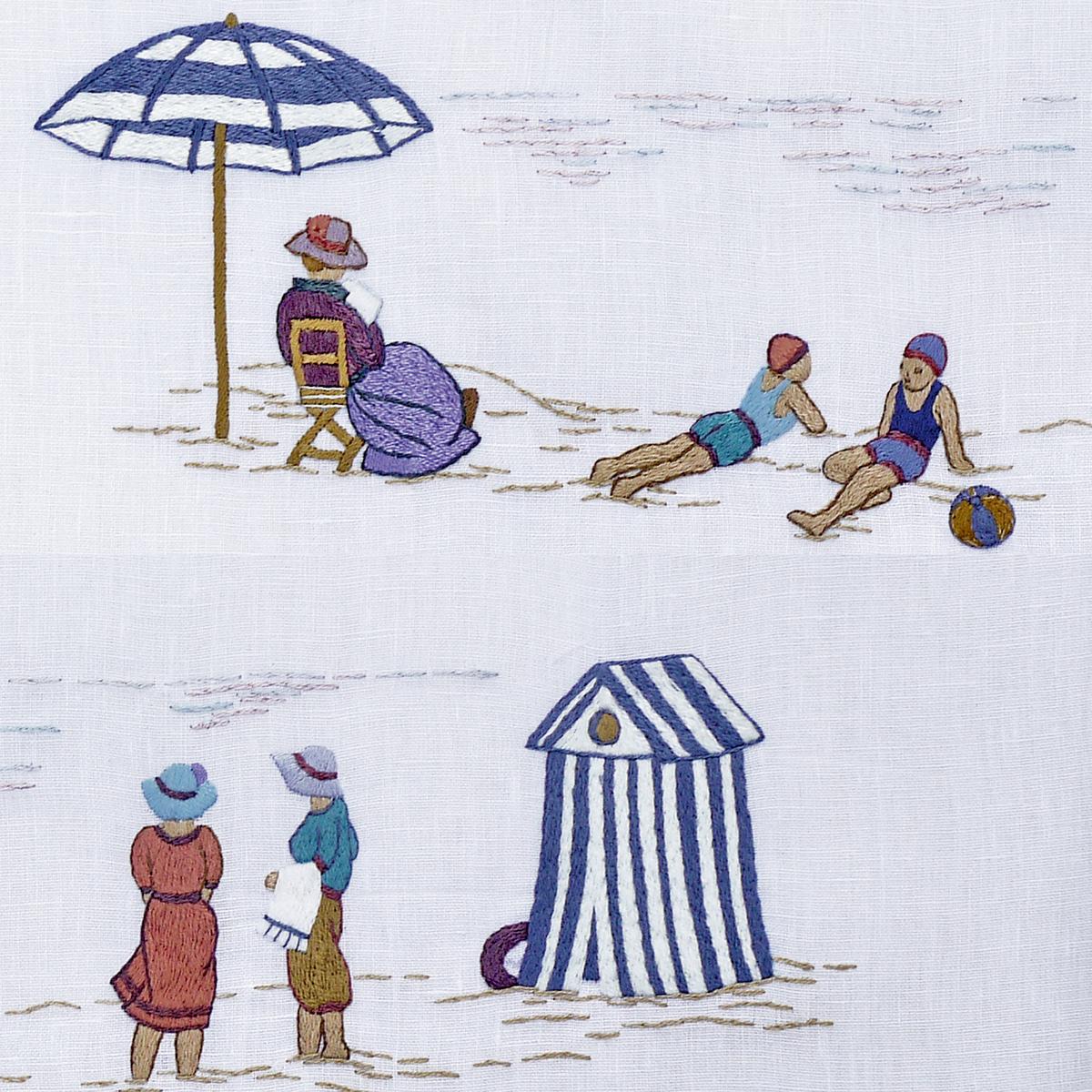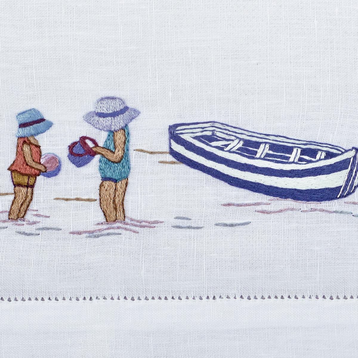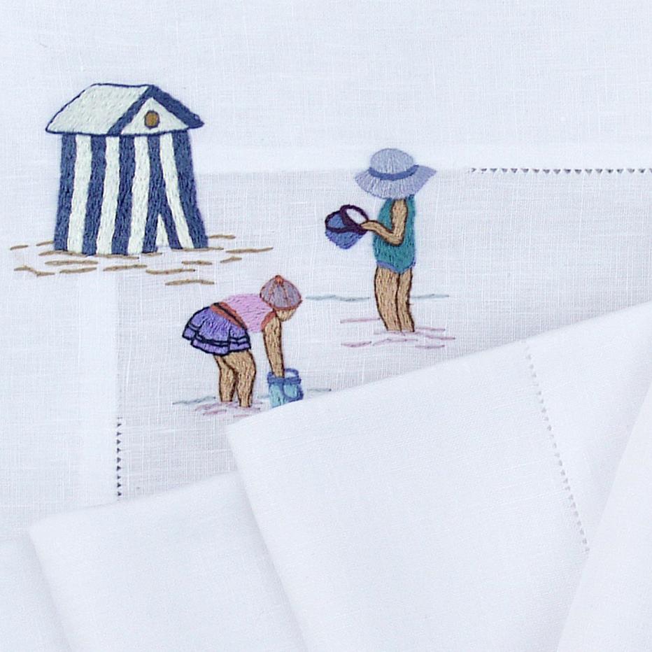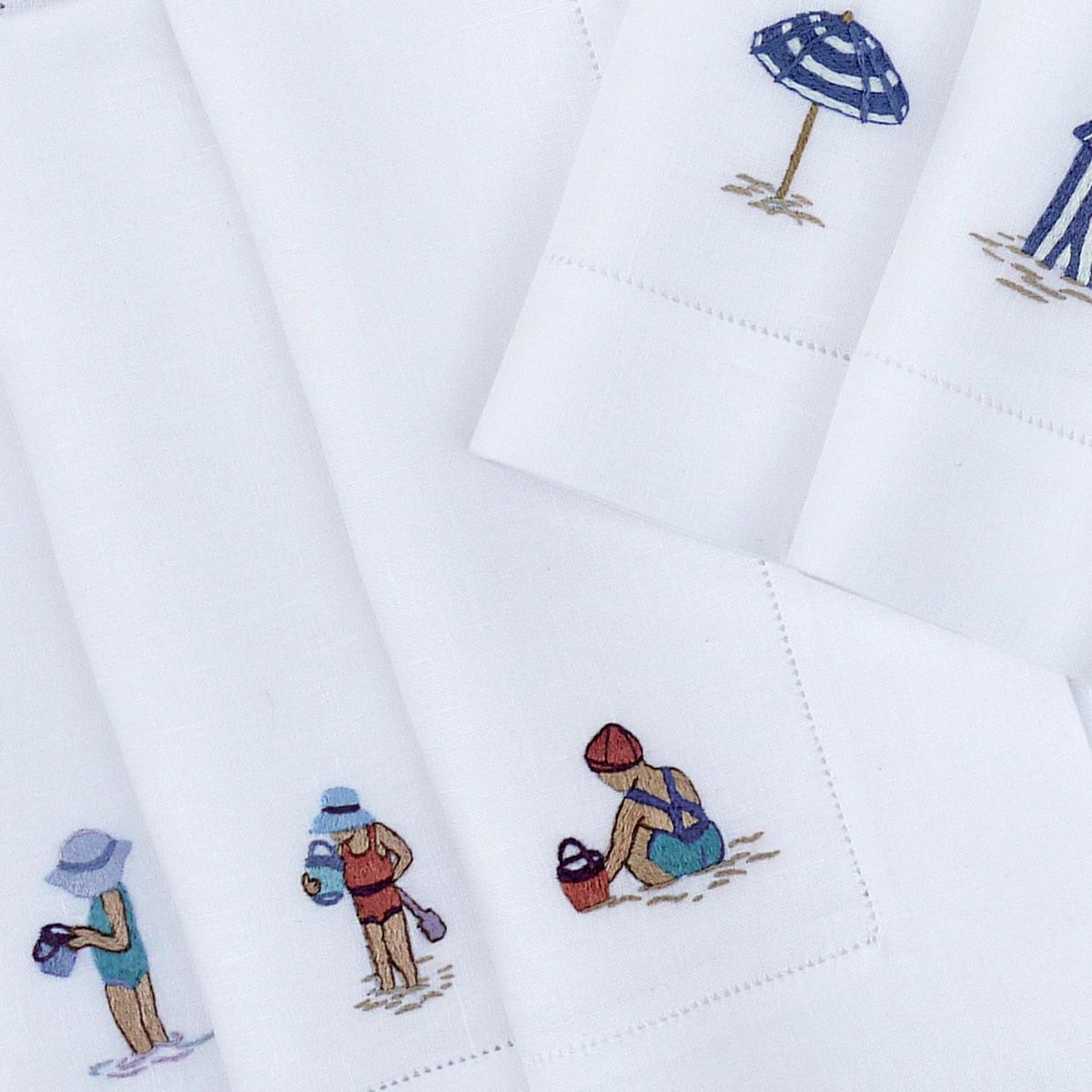 Enjoying a summer holiday at home is no problem with the "Beach Life" table linen. The napkins, place sets, table runners and tablecloths are adorned with different beach motifs. Hand-embroidered on the high-quality linen material are children building sand castles, blue and white sunshades and wellington boots, all of which make you think of happy days spent by the sea. A table with the "Beach Life" table linen from Eri Textiles is able to unfurl its full ocean charm.