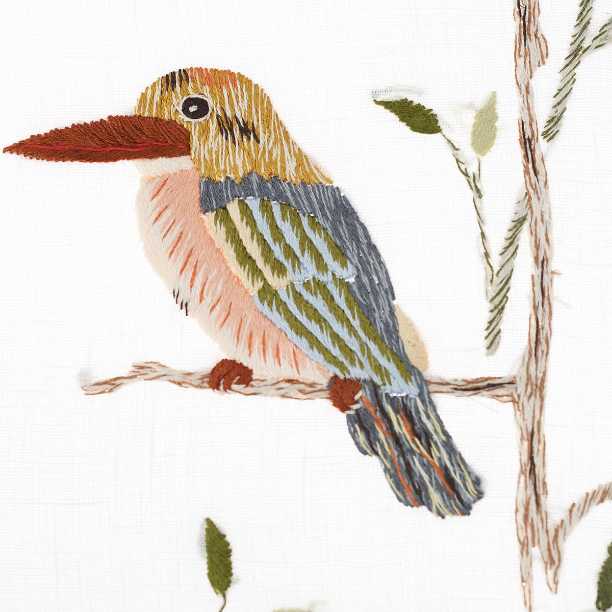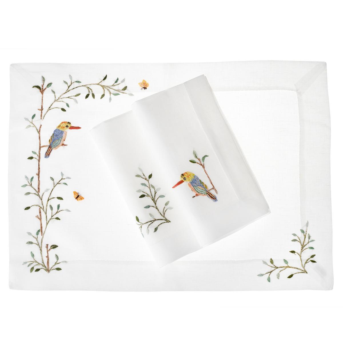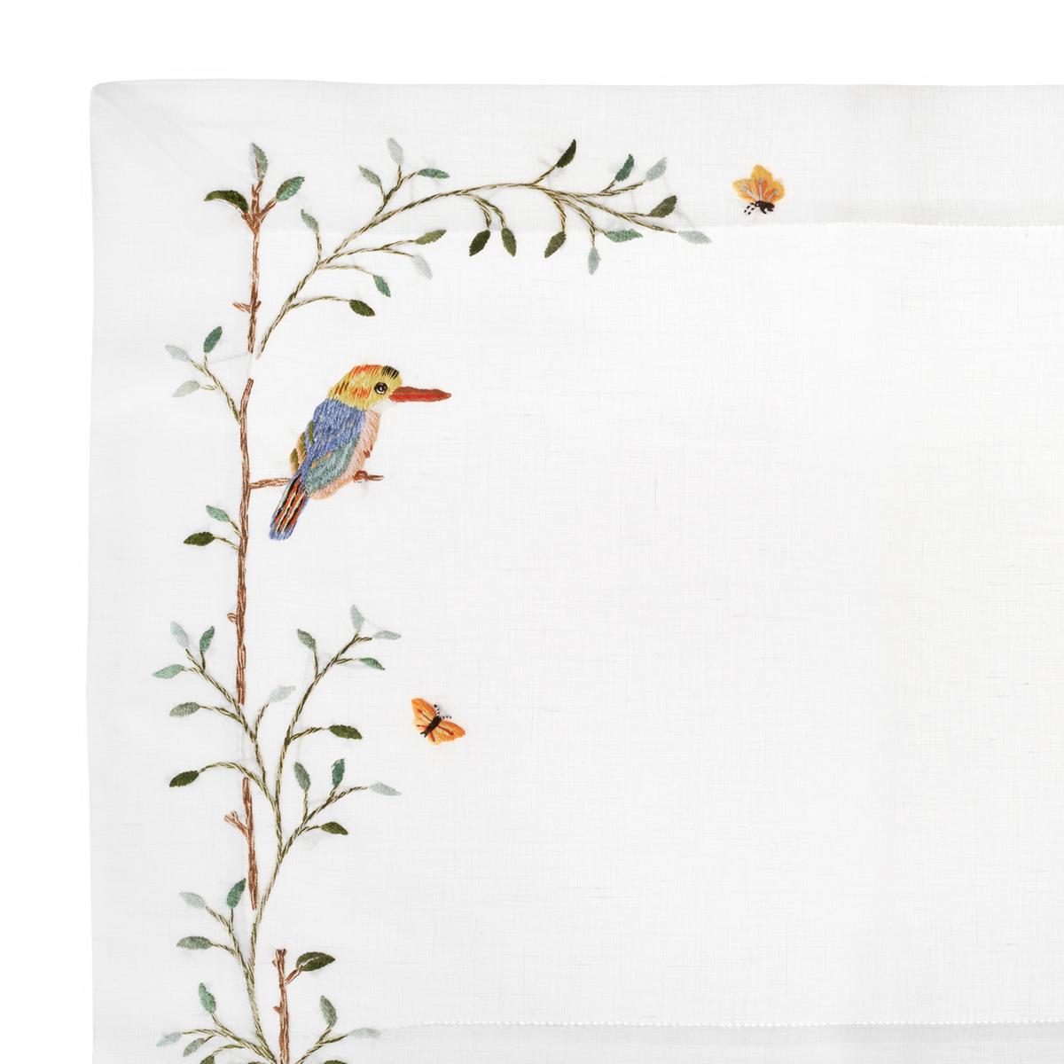 The "Birds" table linen is handcrafted by the company Eri Textiles with great attention paid to the individual details. The bird, with its highly colourful plumage and looking rather like a hummingbird, stands out beautifully against the white linen background. It is framed in an array of delicate leaves of different shades of green.