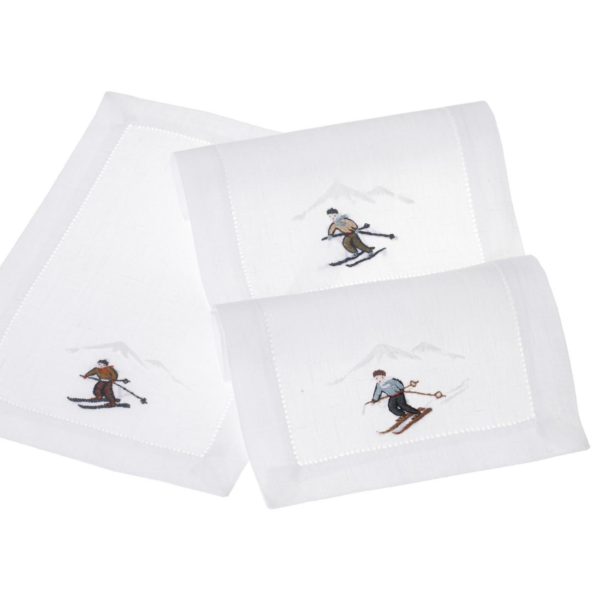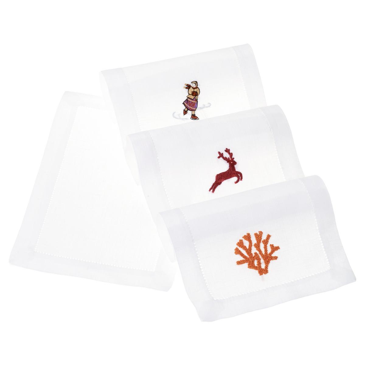 The cocktail napkins from Eri Textiles are of 100% linen and lovingly embroidered by hand. Five different designs of cocktail napkins are available: plain (without embroidery) or embroidered with corals, deer, skiers, or ice-skaters.