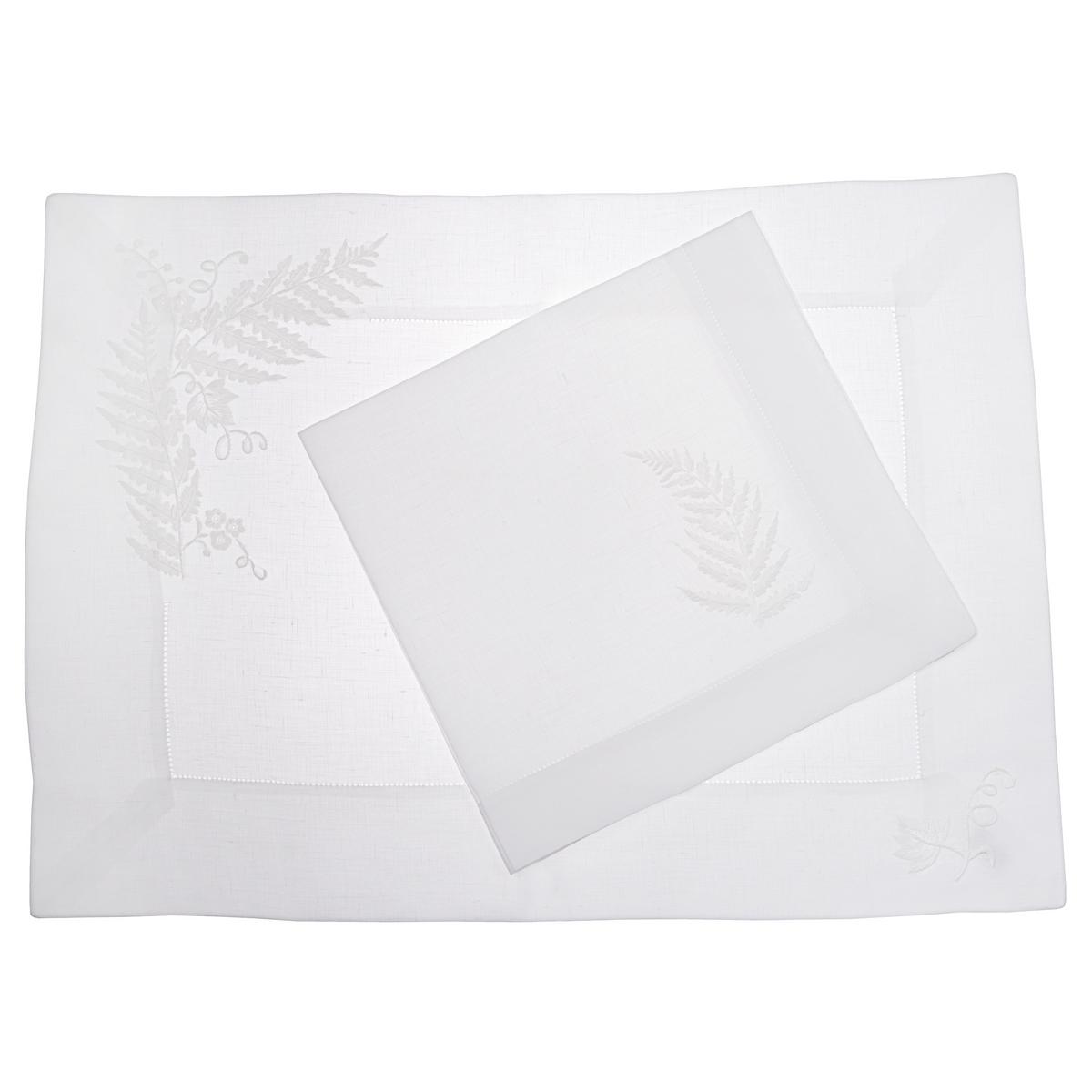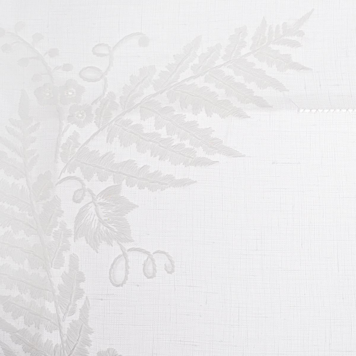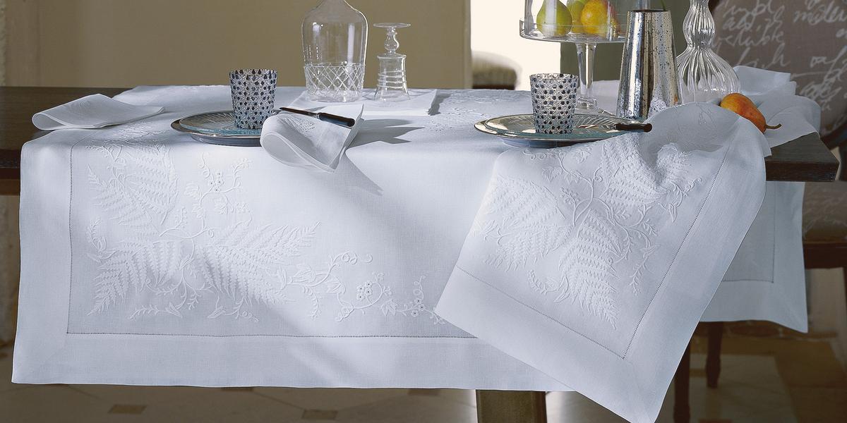 The delicate, hand-embroidered ferns adorning the white linen tablecloth from Eri Textiles provide the ideal base for a traditional or more extravagant décor.