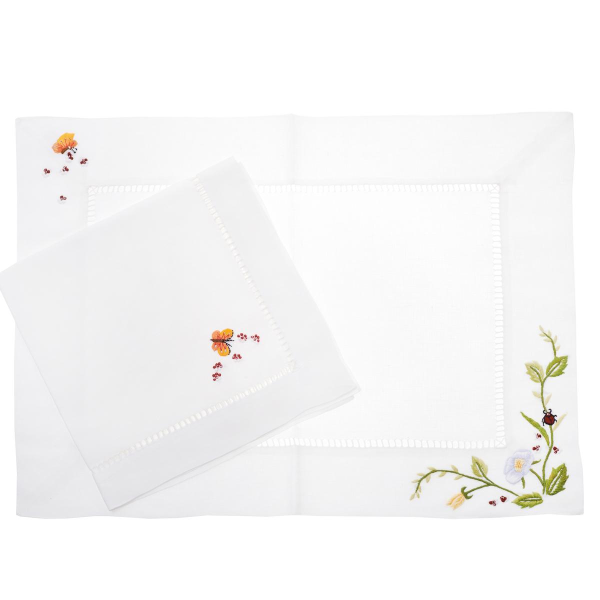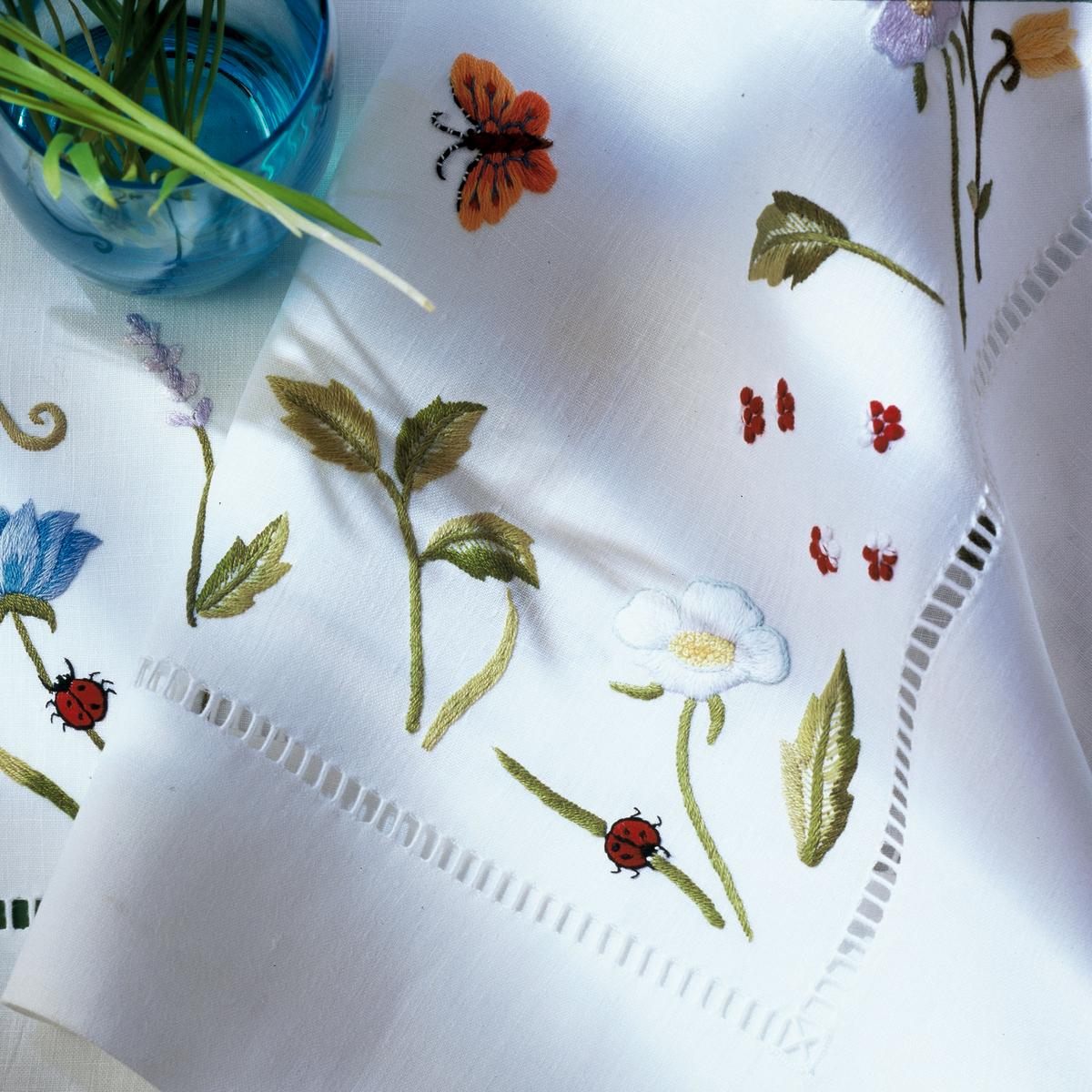 This elegant, hand embroidered table linen will turn your table into a bright flowering meadow. Lady birds and butterflies flutter gaily around the flowers and leaves.The tablecloths can be ordered in special sizes, if required (delivery time: two to three months).