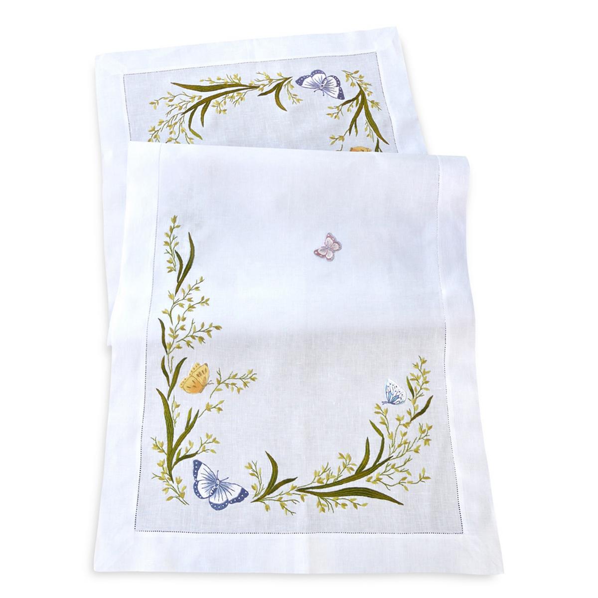 The "Green Meadow" table linen by Eri Textiles charms with a summery motif. Blue and orange butterflies flutter over the green grasses of the meadow and recall some light-hearted childhood memories.