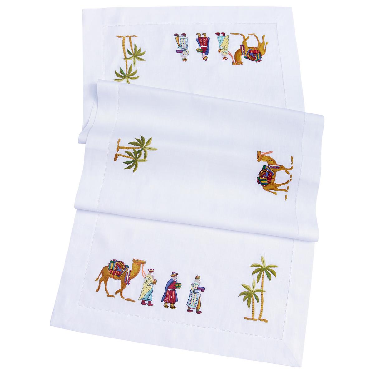 The small caravan of the "Holy Three Kings" passes by palm trees on elegant white linen. The table linen by Eri Textiles inspires with loving details and finely coordinated colours and shades. The "Holy Three Kings" table linen was designed by Erika Lassen. Experienced embroiderers transform the detailed motif into elaborate handwork in the studio of Eri Textiles.