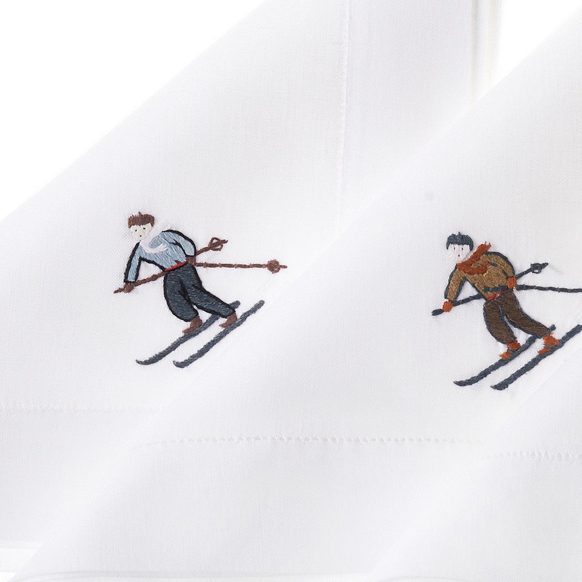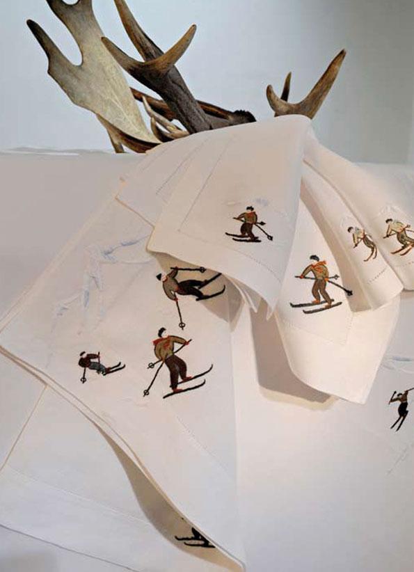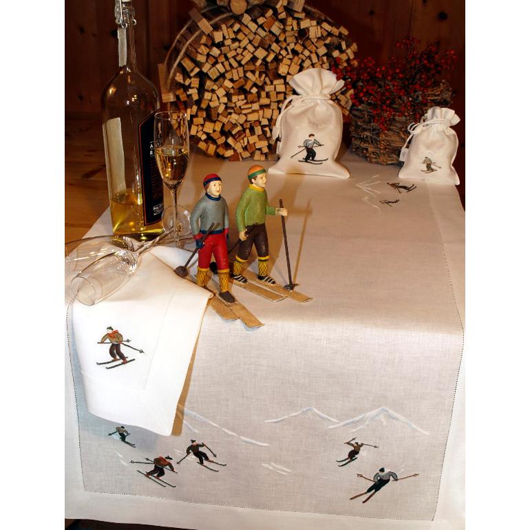 Mountains, snow and invigorating winter sports, this "Skier" linen table cloth will bring a touch of alpine nostalgia and the pleasure of carefree hours to your dining table. The napkins, place mats, runner and tablecloth are made of high-quality linen and are artistically embroidered by hand.