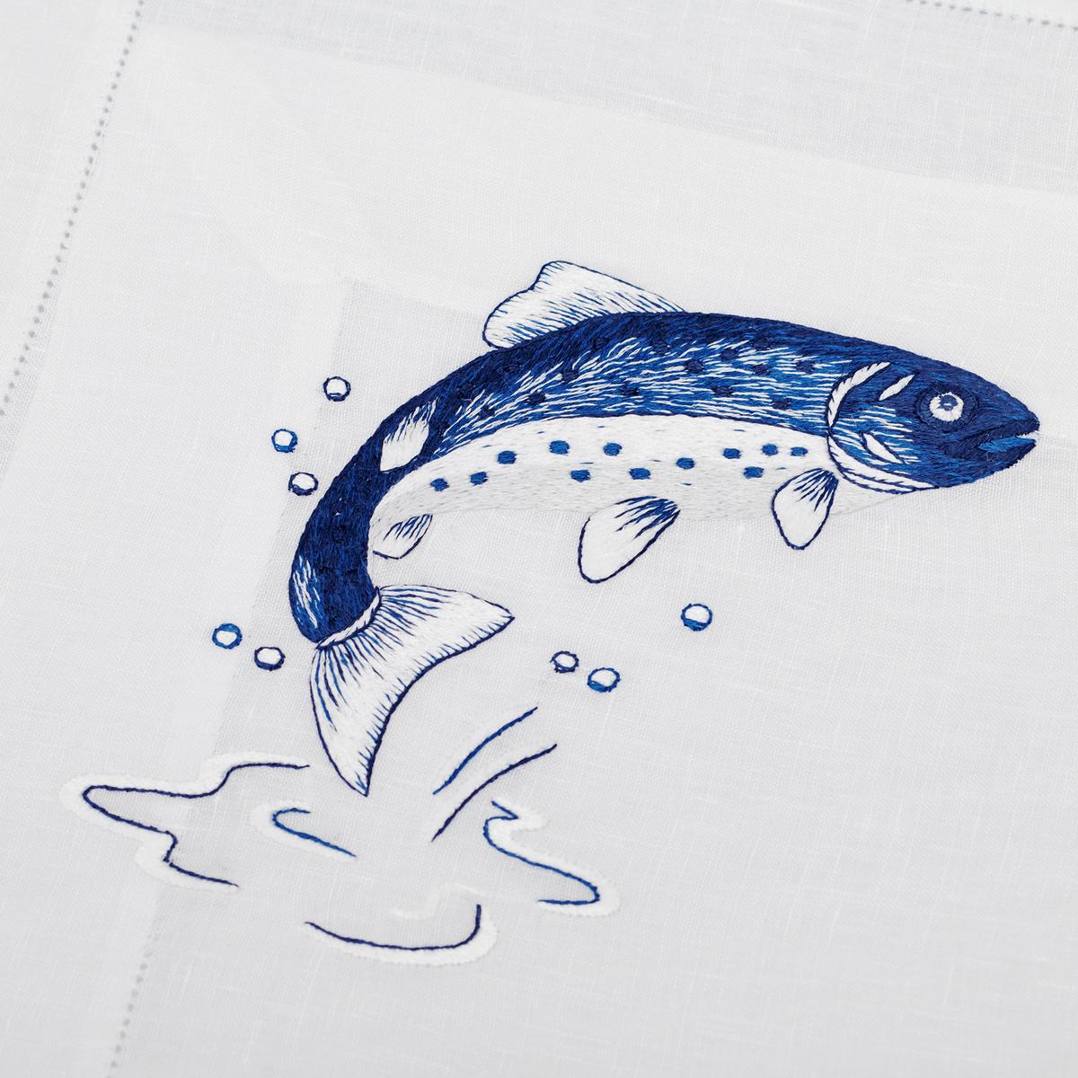 The "Trout" linen table linen by Eri Textiles is elegant and maritime. The white linen and the elaborately hand-embroidered fish motif in blue look fresh and light - perfect for a fish dinner. The table linen made of 100% pure linen was designed by the company founder Erika Lassen. The Bavarian company Eri Textiles produces all its table linen by hand, making each piece unique.