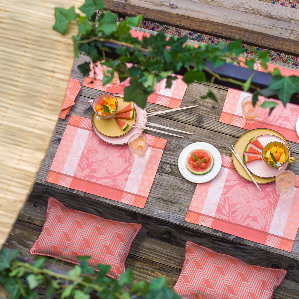 "Nature Urbaine" by Le Jacquard Francais celebrates lush vegetation and radiates summer energy and joy. This collection features an abundance of floral and geometric patterns. The French weaving manufacturer Le Jacquard Francais plays with colours and refined patterns in its collections. The palette ranges from soft pastel shades to vibrant bright colours. Even today, Le Jacquard Francais produces its table linen exclusively in France.