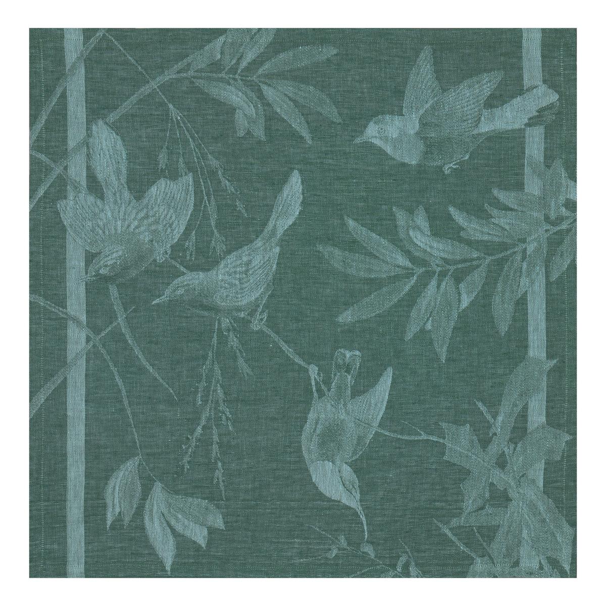 Soft, elegant, infinite: The "Voliere" table linen collection in peacock-green is a collaboration between Le Jacquard Français and the high-end wallpaper studio Quinsai. A flock of birds cavorts between delicate branches and tendrils on finest linen fabrics. The seamless design looks like a window into another world. Rich in detail and woven with high precision, the patterns strike a unique balance between nature and order. On the cool and calming peacock-green, the white designs shimmer like masterful chalk drawings.