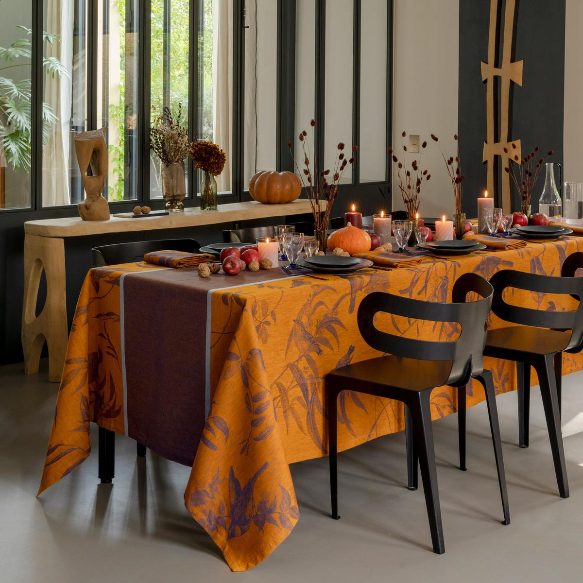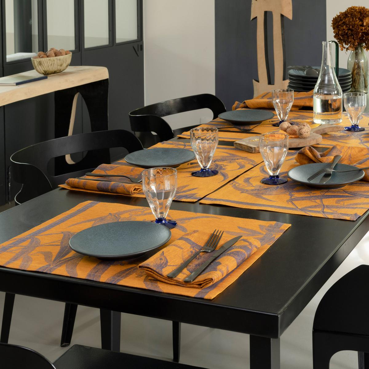 "Voliere" table linen, blue-orange by Le Jacquard Français