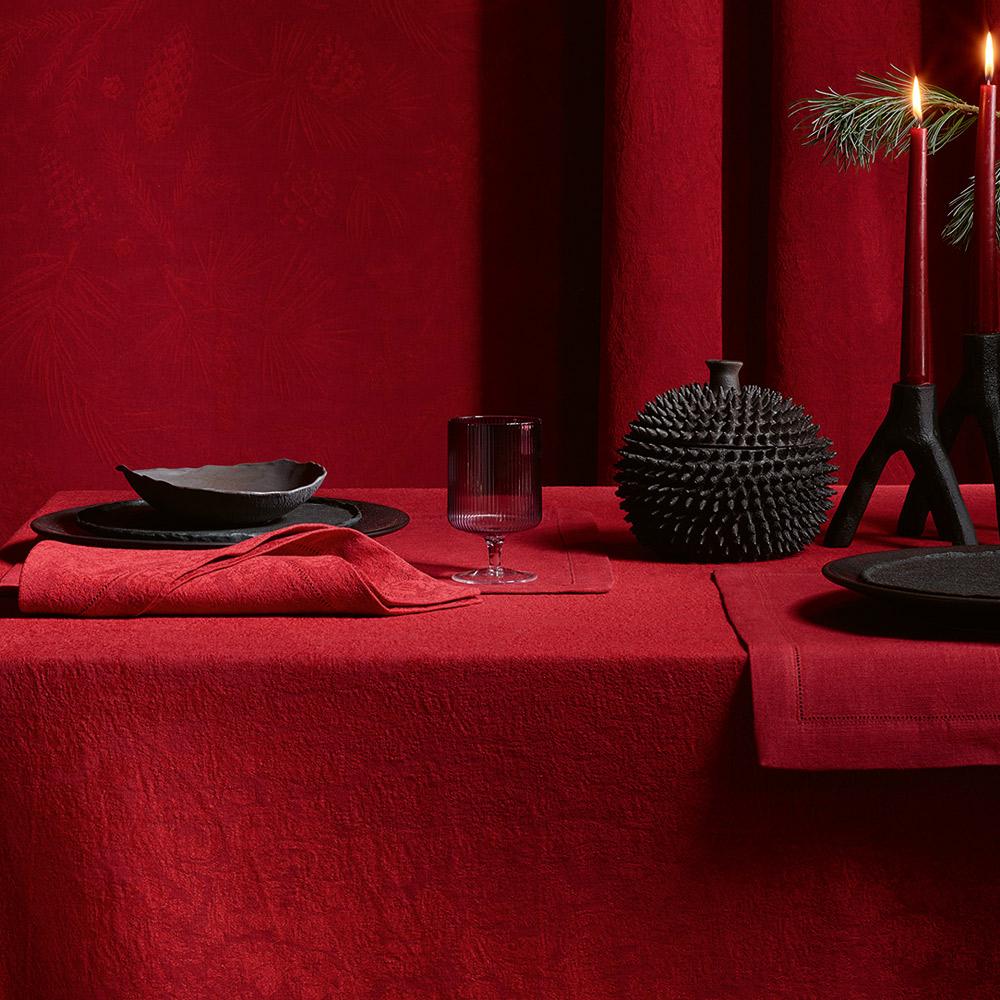 With the "Friuli" table linen in carmine red Leitner creates a wintery ambiance of warmth and coziness. This opulent pure-linen jacquard is based on a sacred linen stole that was crafted between 1730 and 1740 and is today owned by the church of "Chiesa di Ognissanti" in Sutrio, Italy. Its elaborately curved ornamentation consisting of tendrils, flowers and spiraling foliage is very typical of baroque design.