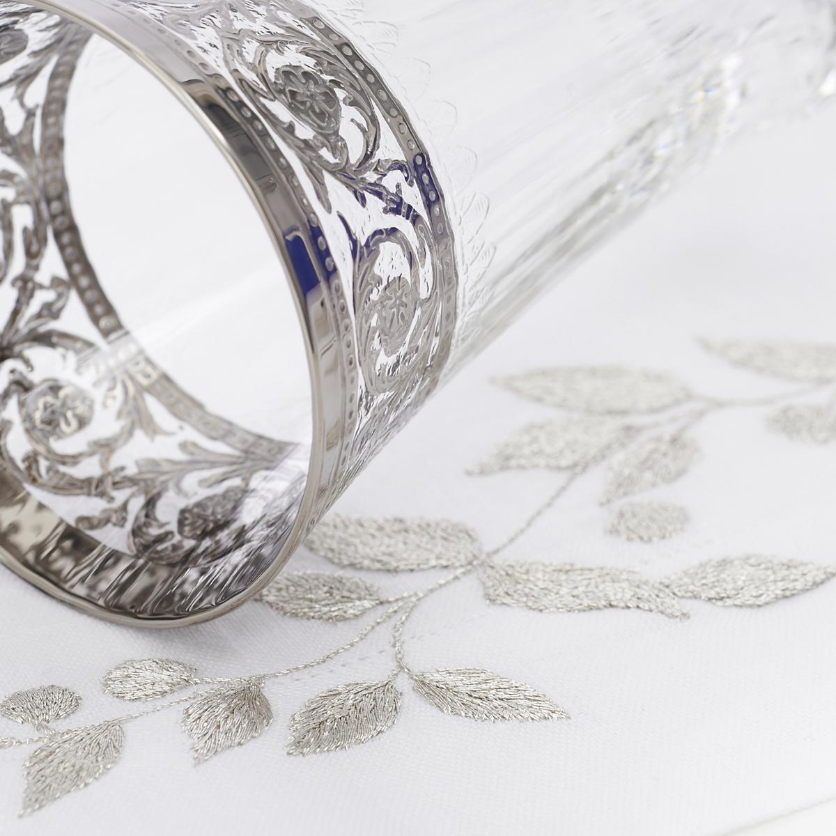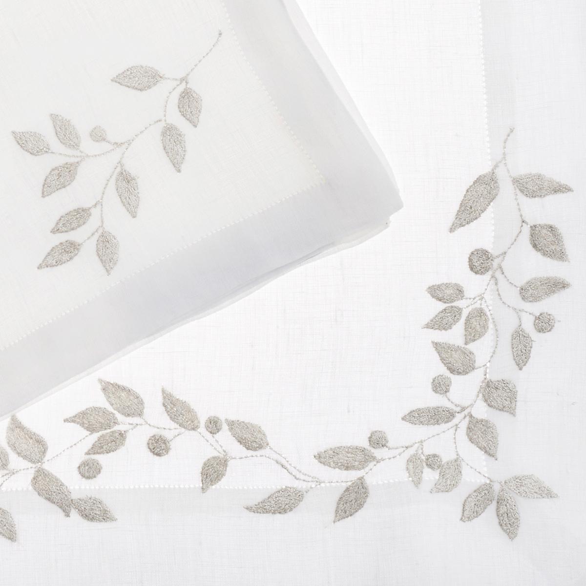 The "Feuilles d'Olivier" table linen in silver by Porthault looks very elegant. The hand-embroidered olive twigs form a beautiful frame and go perfectly with a white or silver-coloured table. Whether as a sign of peace or as a reminder of olive trees of the Mediterranean, olive branches are a beautiful classic motif.